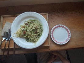 처음은 마르페 브런치(샐러드, 빵, 토마토말린거, 상콤한 레몬소스, 토마토수프, 두유)와 바질 페스토 파스타이다