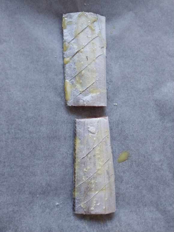 그래서 그 뒤부터는 구을 때 소금을 앞, 뒤로 솔솔 뿌려주고, 칼집도 내고 앞, 뒤로 뿌리는 올리브 오일로 발라준다